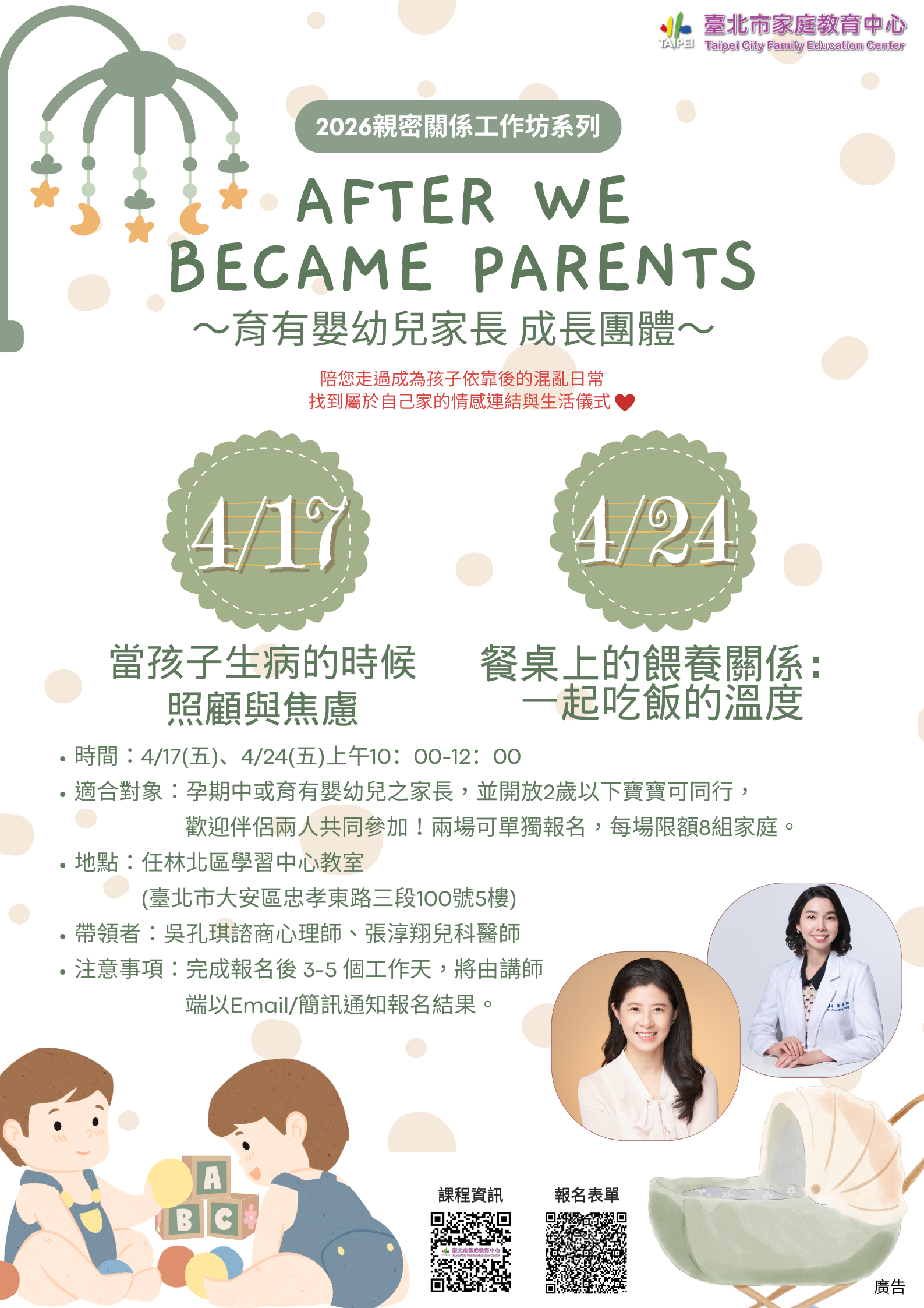 校園公告 公告主旨 陪您在育兒混亂日常中找到屬於自己家的情感連結與生活儀式! 發佈日期 2026 年 4 月 09 日 發佈單位 文書組 公告類別 最新消息 公告等級 無 點閱次數 37 公告內容 陪您在育兒混亂日常中找到屬於自己家的情感連結與生活儀式!歡迎參加臺北市家庭教育中心「親密關係工作坊-育有嬰幼兒家長課程」,即日起開放報名,額滿提早截止,可於本中心網站了解詳情。 相關附件 相關連結 詳情網址 【2026-04-09】抓周活動 【2026-04-09】考選部有你可以大展身手的考試喔!