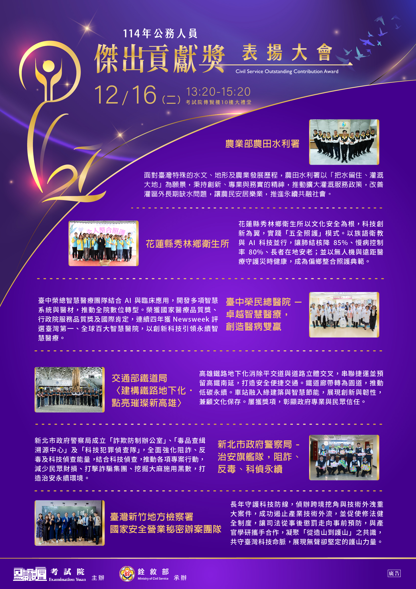 | 公告主旨 | 「114年公務人員傑出貢獻 獎表揚大會」電子海報 |