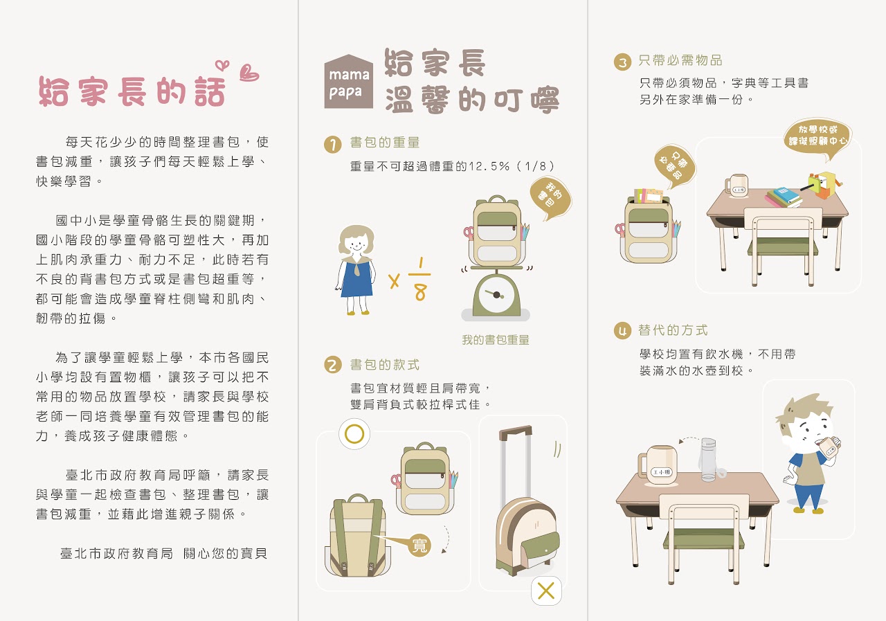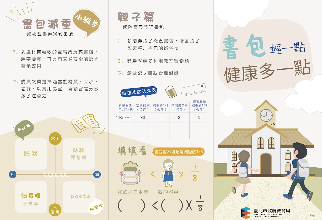 書包減重宣導 為減輕學童壓力來源,培養良好之正確學習習慣與維護身心健康發展。 一、請家長與學校老師一同培養學童有效管理書包的能力,養成孩子健康體態,能輕鬆上學去。 二、請家長與孩子一起檢查書包、整理書包,幫書包減重,以增進親子關係。 教師篇文宣 1. 強化學生書包減重快樂上學觀念 2. 建立班級小組長每日協助檢查制度 3. 定期抽查書包重量固定查核表做紀錄 4. 叮嚀安親補習班書籍、作業勿入帶到學校。 5. 叮嚀當天作業的課本習作才裝入包 6. 叮嚀衣服穿在身,便當盒、雨具多手提,勿裝入包。 7. 揹書包時之正確方式:「兩側肩帶需同時揹上」及「拉緊肩帶」。 8. 宣導文具材質輕又好,如:布料鉛筆袋。 9. 宣導文具減量才舒適(自動鉛筆、橡皮擦、立可帶、各色筆各一就好) 10. 宣導上放學水壺喝光好習慣 11. 教導孩子善加利用置物櫃 12. 課程教學活潑化,減少抄寫作業。